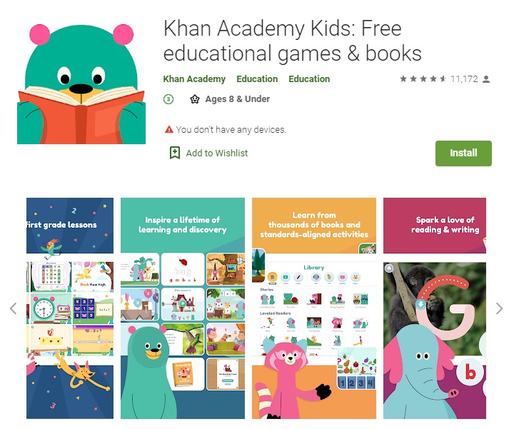 | Khan Academy Kids | Excellent for reading, playing, and learning | Android, iOS, PC |