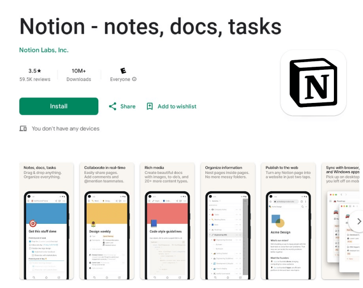 | Notion | Note-taking, page sharing, and team collab | Android, iOS, PC |