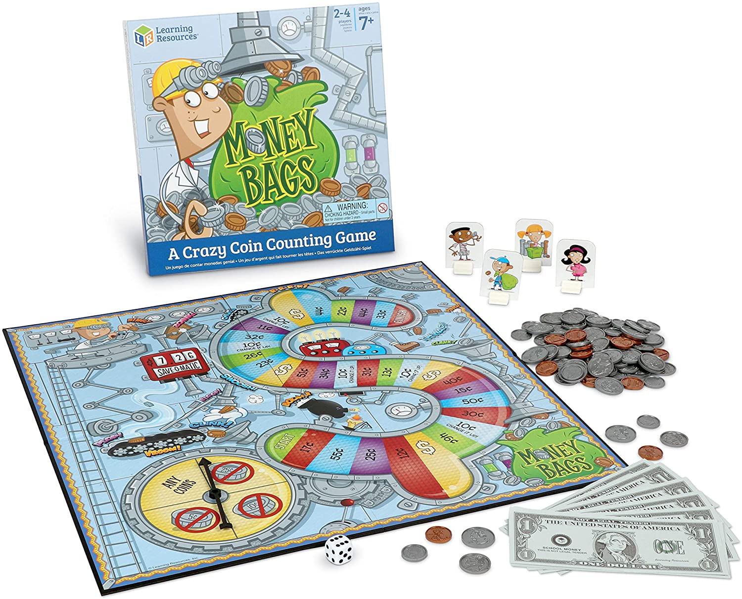 Kids who play this game can practice exchanging, counting, and collecting money with paper dollar bills and plastic coins. Players can solve challenges like figuring out how not to use quarters if they want to get 38 cents from the bank. Collect the most money to win!