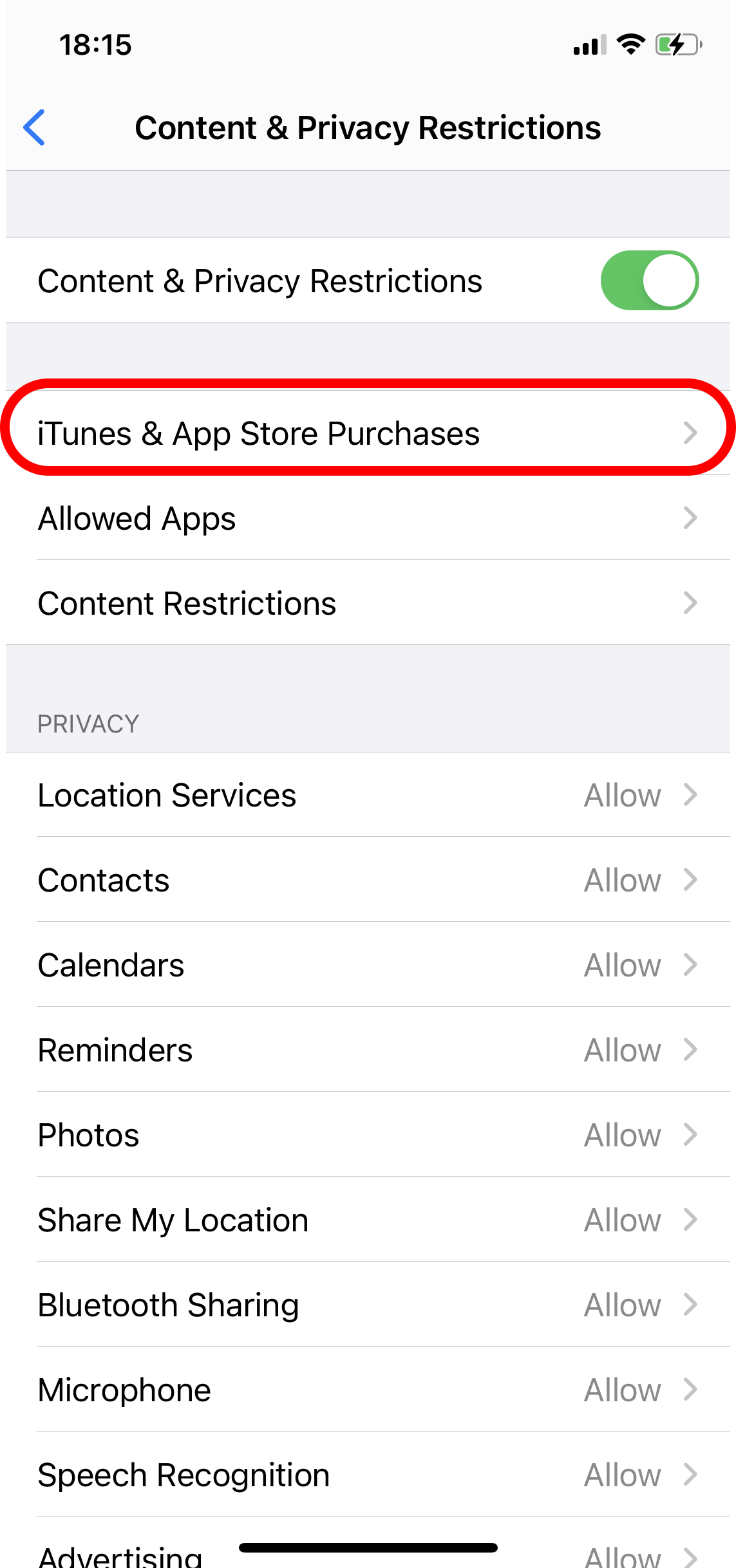 - Next, click on iTunes and App Store Purchases to either block or enable app installation, deletion, and purchases—this can prevent your kids from inadvertently (or deliberately!) buying updates for games. You may also require a passcode for in-app purchases if preferred.