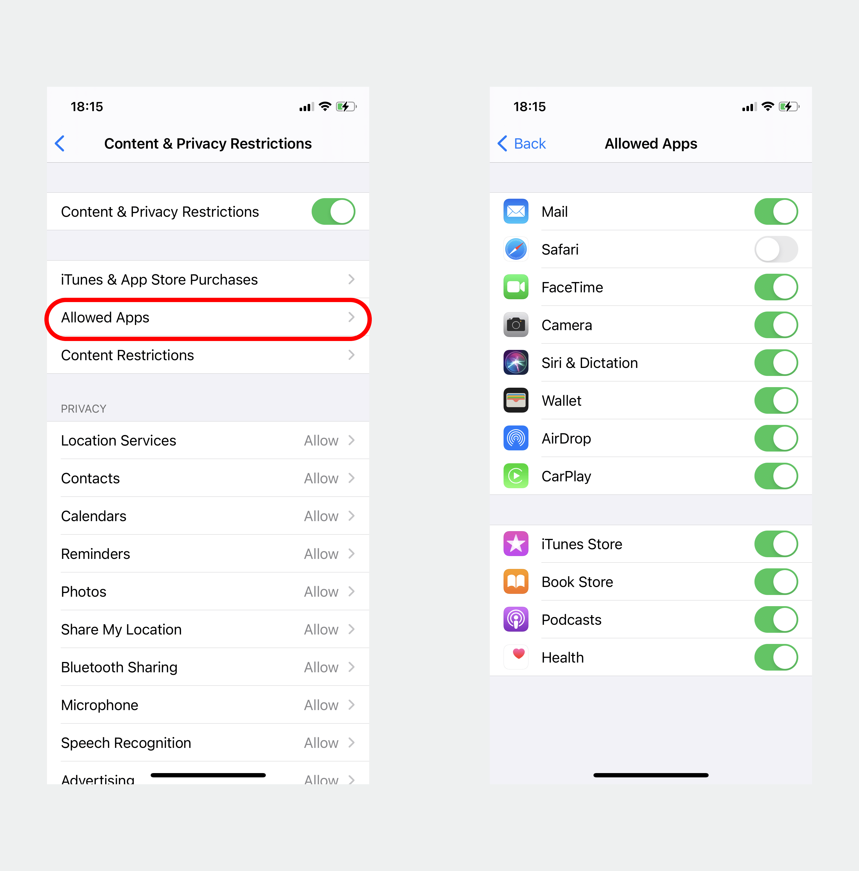 - Go back to the Content and Privacy Restrictions page and open the Allowed Apps. When opened, you should see a list of enabled apps on the screen. Turn off the apps you want to disable, and the app will completely disappear from the Home Screen. Turning it on again will return it to the home screen.