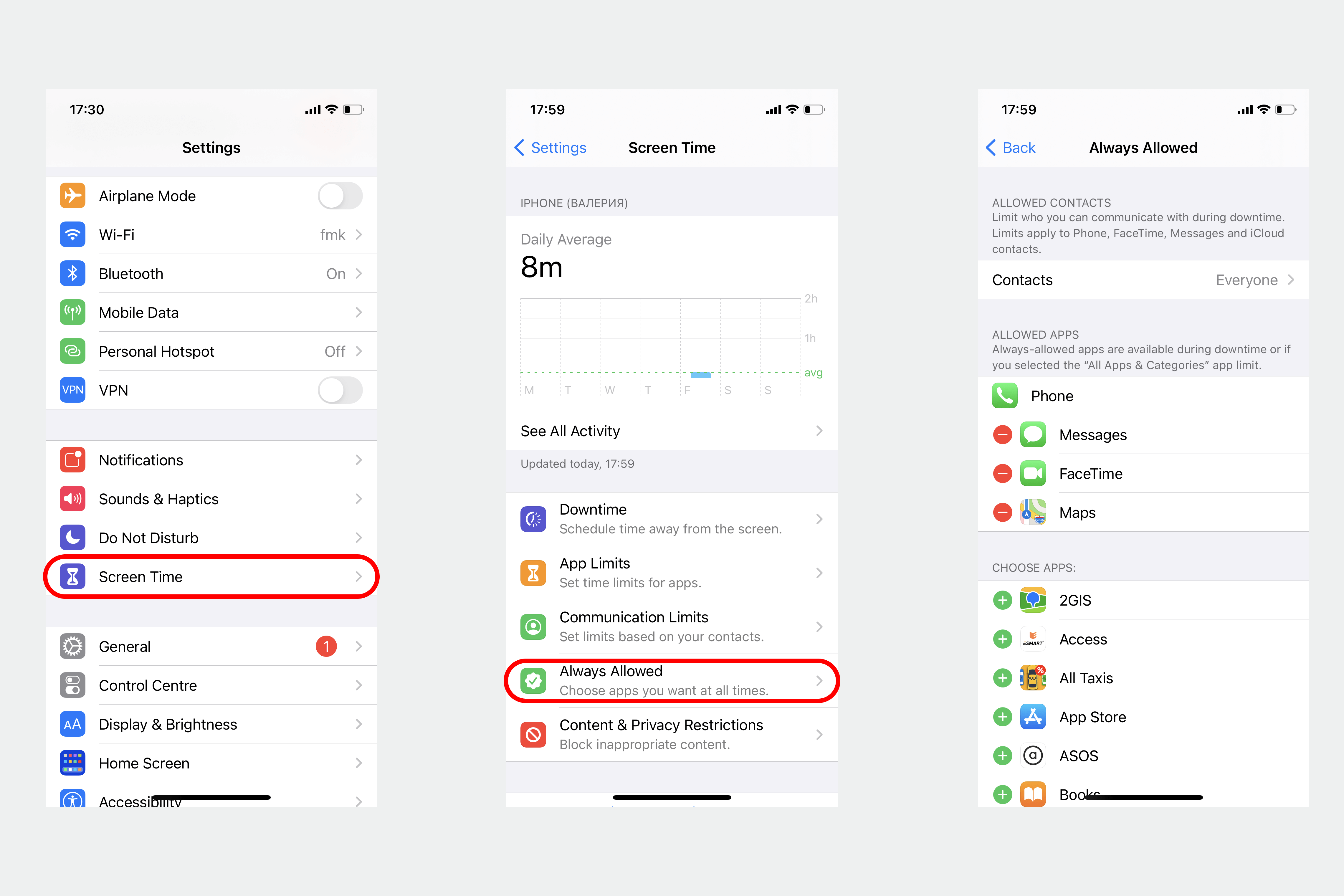 - Next, return to Screen Time, tap options in Settings, and select the Always Allowed button. This will open a page with a list of apps automatically enabled for use even during Downtime—phone, messages, maps, and FaceTime included.
