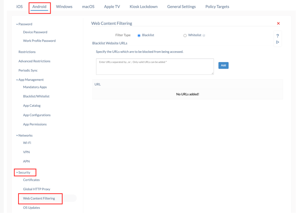 To manually set up and manage a web filter to block adult content, head to the Security Center of your Android device and select Web Content Filtering—now click Configure. Set the filter type as Blacklist and enter the URL of the website you wish to block in the textbox. You can add to this list of blocked sites as necessary.