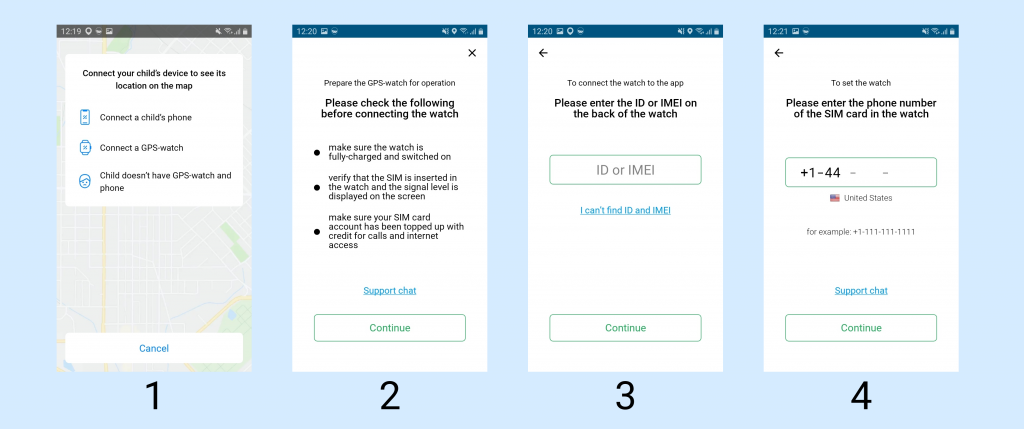 - On the screen of adding a child’s device, press ‘Connect GPS-watch’. Read carefully the smartwatch’s instructions on the next screen and check all items. Press ‘Continue’. Enter the phone number and press ‘Continue’.
