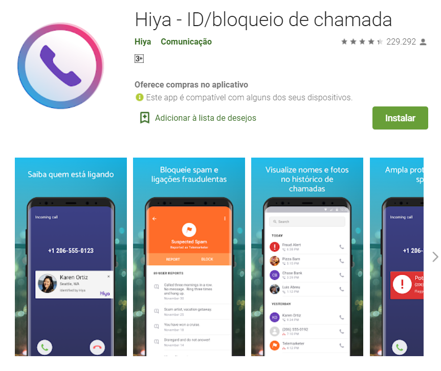 Com mais de 10 milhões de downloads e uma pontuação de 4,4 estrelas na loja de aplicativos do Google, o Hiya é um sistema excelente que não só permite detectar as chamadas recebidas, mas também bloqueá-las, gerar relatórios para outros usuários, etc. Além disso, o sistema oferece alertas de segurança cada vez que o seu celular recebe ligações de números considerados perigosos ou indesejáveis.