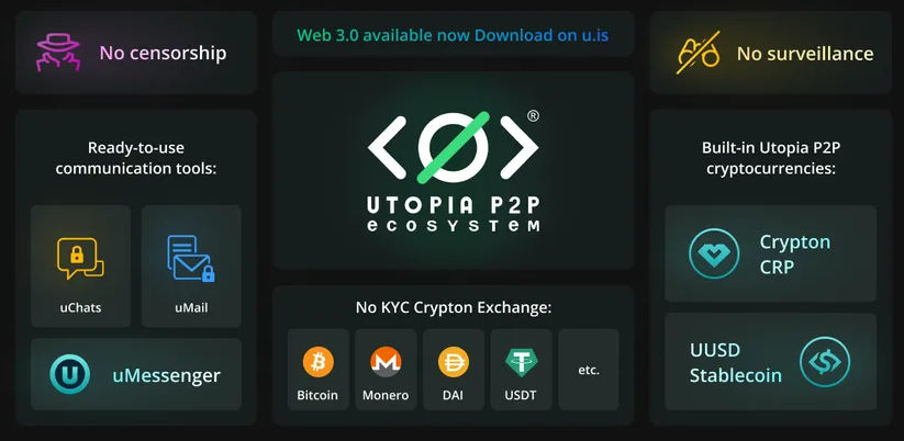 Utopia is a private and secure communication platform built on top of a decentralized peer-to-peer network that makes use of blockchain technology. It offers voice and video conferencing, file sharing, and secure and private messaging.