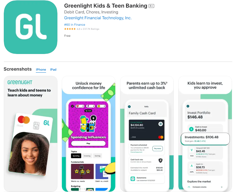 When it comes to parenting apps to help your kids learn how to manage money, GreenLight is a popular option. Use the app to connect your kids’ allowance to chores, and there’s the opportunity for your child to earn 1% cashback on spending with the Visa debit card they’ll receive as part of the subscription.