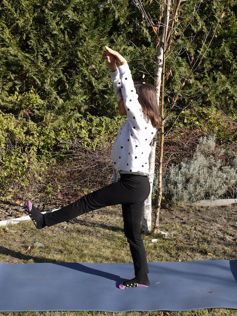 Stand side-by-side with your kid. Hold both hands together. Stand on the inner leg and wrap the outer leg around the standing leg. Try to bend slightly like you are perching on a tree like an Eagle.