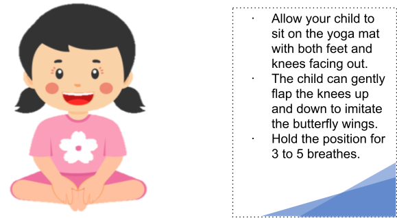 The butterfly pose is one of the most popular animal poses for kids, and kids enjoy it. Let the kid sit on the floor and bring both feet together on each ankle. Then gently move their knees up and down, imitating the butterfly wings.