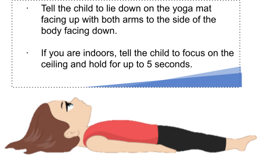 Make the child lie down flat on their belly. Let them place their palms on the ground directly below their shoulders and straighten their arms. Then let them lift their head and torso off the floor. Hold for 5 to 10 seconds.